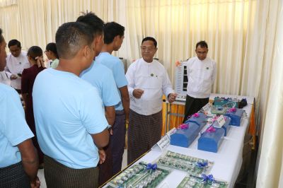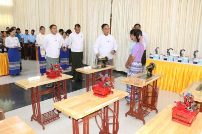 ယင်းနောက် ပြည်ထောင်စုဝန်ကြီးက စက်ချုပ်နည်းပညာသင်တန်းမှ သင်တန်းဆင်း (၁၀) ဦး အတွက် အပ်ချုပ်စက်နှင့် ဆက်စပ်ပစ္စည်းများကိုလည်းကောင်း၊ အမြဲတမ်းအတွင်းဝန်က မော်တော် ဆိုင်ကယ်ပြုပြင်ထိန်းသိမ်းနည်းပညာသင်တန်းဆင်း (၅) ဦးအတွက် ဘတ္ထရီအားသွင်းကိရိယာ၊ ဖိအားမြင့် ရေဖြန်းစက်၊ လက်သုံးကိရိယာအစုံ၊ T-Spanner အစုံ၊ သံလိုက်တုံးဖြုတ်ကိရိယာနှင့် ၄" ကျောက်စက်များကိုလည်းကောင်း၊ ကျေးလက်ဒေသဖွံ့ဖြိုးတိုးတက်ရေးဦးစီးဌာန၊ ညွှန်ကြားရေးမှူး ချုပ်က လူသုံးကုန်ထုတ်လုပ်မှုနည်းပညာသင်တန်းဆင်း (၅) ဦးအတွက် စတီးကန်၊ Liquid Soap Mixer နှင့် Balance ကိုလည်းကောင်း၊ ကျေးလက်လမ်းဖွံ့ဖြိုးရေးဦးစီးဌာန၊ ညွှန်ကြားရေးမှူးချုပ်က စားသောက်ကုန်ထုတ်လုပ်မှု နည်းပညာသင်တန်းဆင်း (၅) ဦးအတွက် Electric Dryer နှင့် ခြေနင်း အိတ်ပိတ်စက်များကိုလည်းကောင်း ပေးအပ်ခဲ့ပြီး အသေးစားစက်မှုလက်မှုလုပ်ငန်းဦးစီးဌာန၊ ညွှန်ကြားရေးမှူးချုပ်က သင်တန်းဆင်းများကိုယ်စား သင်တန်းဆင်း (၁) ဦးအား သင်တန်းဆင်း လက်မှတ်များ ပေးအပ်ခဲ့ပြီး မှတ်တမ်းတင်ဓာတ်ပုံ ရိုက်ကူးခဲ့သည်။