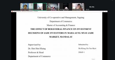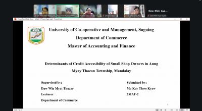 သမဝါယမနှင့်စီမံခန့်ခွဲမှုပညာတက္ကသိုလ်(စစ်ကိုင်း)၊ ဝါဏိဇ္ဇဗေဒဌာနမှ ဦးစီးသည့် Master of Accounting and Finance ကျောင်းသား/ကျောင်းသူများ၏ Title Defence ကို (၂၃.၁၂.၂၀၂၅)ရက်နေ့၌ Video Conferencing စနစ်ဖြင့် ကျင်းပခဲ့ရာ Board of Examiner များအဖြစ် ပါမောက္ခချုပ်၊ ဒုတိယပါမောက္ခချုပ် (သင်ကြား)၊ ဝါဏိဇ္ဇဗေဒဌာနမှ ပါမောက္ခ (ဌာနမှူး)၊ ပါမောက္ခ၊ တွဲဖက်ပါမောက္ခနှင့် ပြင်ပပညာရှင်များဖြစ်ကြသည့် ဒေါက်တာမို့မို့ရီ [ပါမောက္ခချုပ်(ငြိမ်း)၊ သမဝါယမနှင့်စီမံခန့်ခွဲမှုပညာတက္ကသိုလ်(စစ်ကိုင်း)]၊ ဒေါ်ခင်အေးမြင့် [ပါမောက္ခဌာနမှူး(ငြိမ်း)၊ သမဝါယမနှင့်စီမံခန့်ခွဲမှုပညာတက္ကသိုလ် (စစ်ကိုင်း)]၊ ဒေါက်တာ ဒေါ်တင်လှ (DBA Programme Leader, Myanmar Imperial Collage, Partnership with The Great Manchester University)တို့မှ တက်ရောက်ခဲ့ကြပြီး Master of Accounting and Finance မဟာတန်း ကျောင်းသူ(၃)ဦး၏ စာတမ်းများနှင့် ပတ်သက်၍ လိုအပ်သည်များကို လမ်းညွှန်ခဲ့ကြပါသည်။