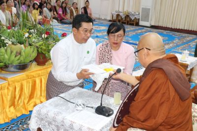 ထို့နောက် ပြည်ထောင်စုဝန်ကြီးနှင့် ဇနီး၊ ဒုတိယဝန်ကြီး၊ အမြဲတမ်းအတွင်းဝန်နှင့် ညွှန်ကြား ရေးမှူးချုပ်များက ဆရာတော်သံဃာတော် အရှင်သူမြတ်တို့ထံ ဆွမ်းဆန်တော်၊ ဆွမ်းဆီတော်၊ သင်္ကန်းနှင့်တကွ ဒါတဗ္ဗဝတ္ထုအစုစုတို့အား ဆပ်ကပ်လှူဒါန်းကြပြီး ဆရာတော် ဘဒ္ဒန္တအရှင် ဂန္ဓမာလာထံမှ အနုမောဒနာတရား နာကြား၍ ကုသိုလ်ကောင်းမှုအစုစုတို့အတွက် ရေစက်သွန်းချ အမျှပေးဝေခဲ့ကြပါသည်။