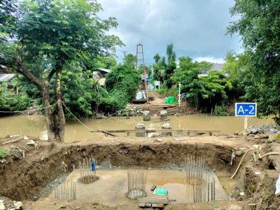 နေပြည်တော် ကျေးလက်လမ်းဖွံ့ဖြိုးရေးဦးစီးဌာန (ရုံးချုပ်) မှ စစ်ဆေးရေးအရာရှိချုပ် ဦးရဲခေါင်ထွန်း၊ စီမံကိန်းစစ်ဆေးရေးနှင့် အရည်အသွေးထိန်းသိမ်းရေးဌာနခွဲမှ ဦးစီးအရာရှိ(မြို့ပြ) ဦးမောင်မောင်မိုးဝင်းတို့က ၂၀၂၃-၂ဝ၂၄ ဘဏ္ဍာရေးနှစ် ပြည်ထောင်စု ငွေလုံးငွေရင်း ရန်ပုံငွေကျပ် ၄ဝ၅ ဒသမ ဝဝ သန်းဖြင့် ရုံးချုပ် တံတား တည်ဆောက်ရေးဌာနခွဲက တာဝန်ယူဆောက်လုပ်လျက်ရှိသော မိုးကုတ် (စိန်တောင်) တံတားအရှည် ပေ ၉၀၊ အကျယ် ပေ ၂၀ ရှိ ဘိုးပိုင်အုတ်မြစ် သံကူကွန်ကရစ်တံတား တည်ဆောက်ရေးလုပ်ငန်းကို ကြည့်ရှုစစ်ဆေးရာ မြို့နယ်ဦးစီးအရာရှိ (မြို့ပြ) ဦးမြင့်လင်းက တံတားတည်ဆောက်ပြီးစီးမှုကို ရှင်းလင်းတင်ပြသည်။
