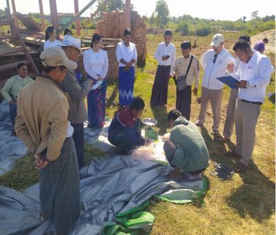 ကချင်ပြည်နယ်၊ မြစ်ကြီးနားမြို့နယ်တွင် နိုင်ငံ့စီးပွားမြှင့်တင်ရေးရန်ပုံငွေမှ မတည်ပံ့ပိုးငွေဖြင့် မော်ဖောင်း(၁)ကျေးရွာရှိ ငါးအိုးစိုက်ပျိုးရေးနှင့်အထွေထွေလုပ်ငန်းသမဝါယမအသင်းလီမိတက်မှ အသင်းသားတောင်သူ ဦးချစ်ရွှေပိုင် လယ် ၁၈ ဧကတွင် GW-11 စပါးမျိုး ၅ ဧက စံကွက် ရိတ်သိမ်းမှုအခြေအနေကို နိုဝင်ဘာ ၂၀ ရက်နေ့က ပြည်နယ်သမဝါယမဦးစီးဌာန ညွှန်ကြားရေးမှူး ဒေါ်ချောစုလှိုင်၊ ပြည်နယ်လယ်ယာမြေစီမံခန့်ခွဲရေးနှင့်စာရင်းအင်းဦးစီးဌာနမှ ညွှန်ကြားရေးမှူး ဦးသန်းမြင့်၊ မြို့နယ်စီမံအုပ်ချုပ်ရေးကော်မတီမှ ဦးတိုးတိုးထွန်း၊ ခရိုင်၊ မြို့နယ်အဆင့်စိုက်ပျိုးရေး ကြီးကြပ်မှုကော်မတီမှ တာဝန်ရှိသူများ၊ မြို့နယ်သမဝါယမဦးစီးဌာန ဦးစီးအရာရှိနှင့် ဝန်ထမ်းများ လိုက်ပါ၍ ကွင်းဆင်းကြည့်ရှုစစ်ဆေးခဲ့သည်။